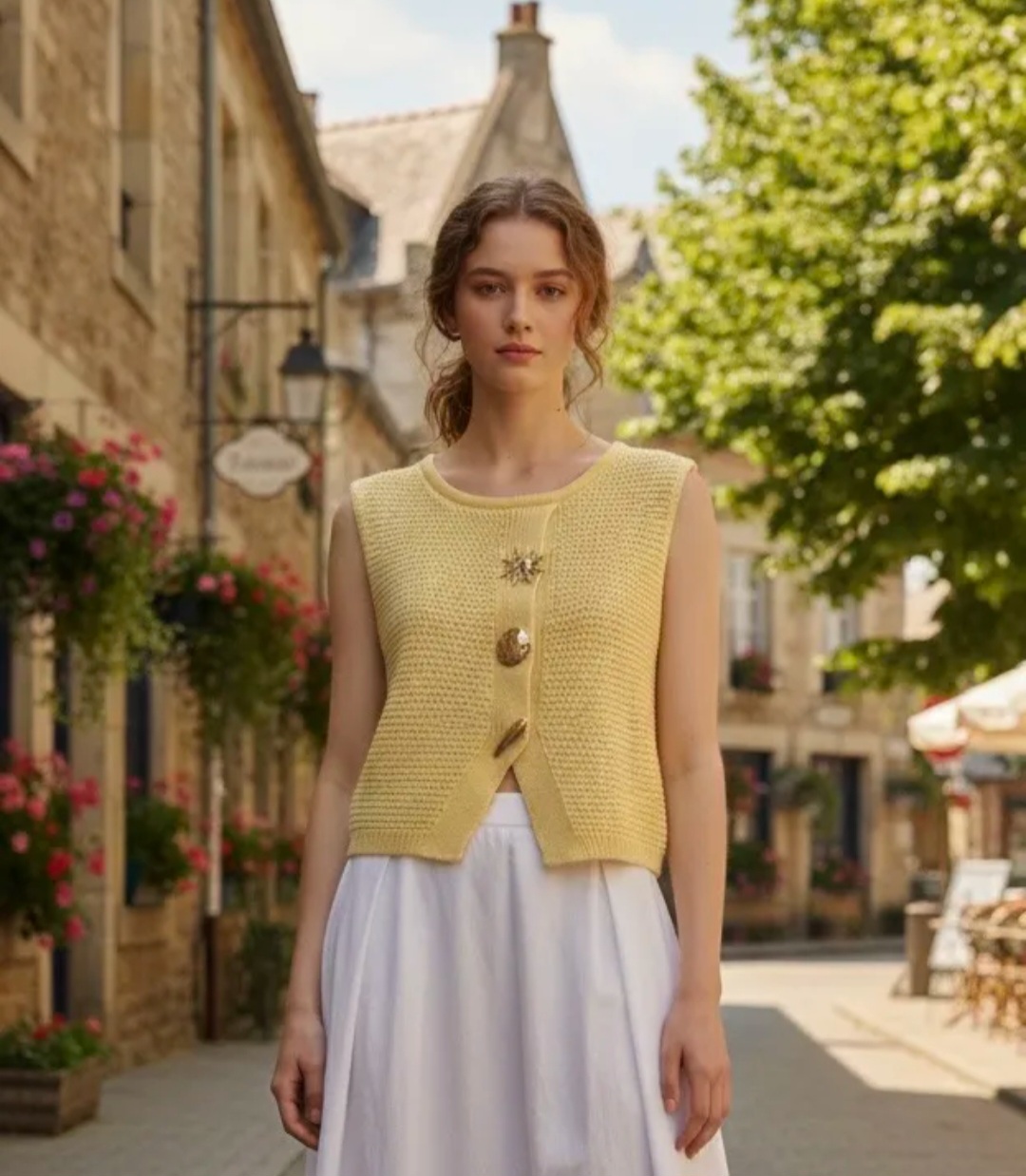 Débardeur en crochet très tendance avec 3boutons bijoux dorés.