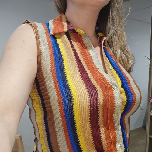 Ensemble top et pantalon crochet rayé multicolore. Style années 70’S voir Carribean Style.