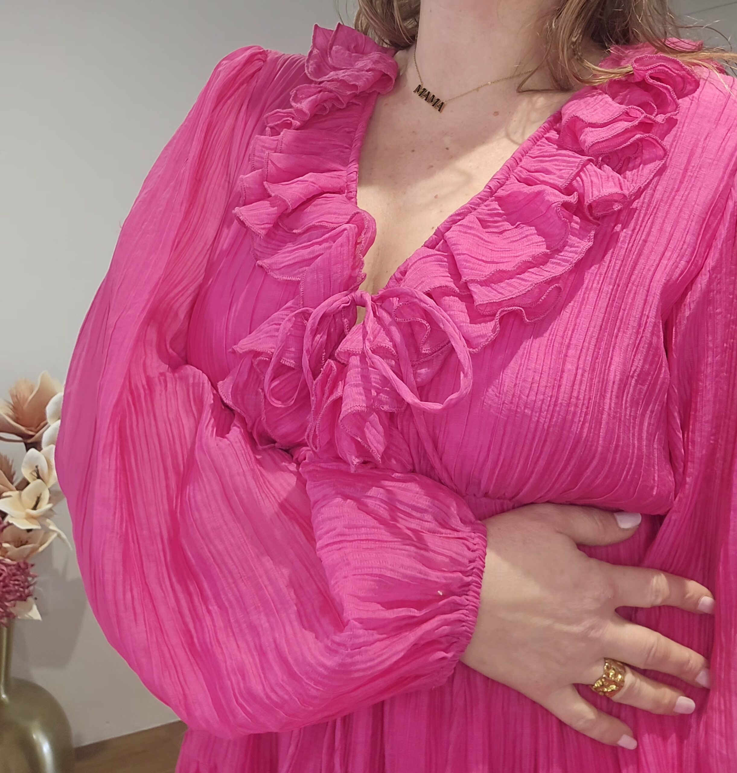Décolté plongeant avec volant, matière fluide et légère, manches longues bouffantes, tout y est.