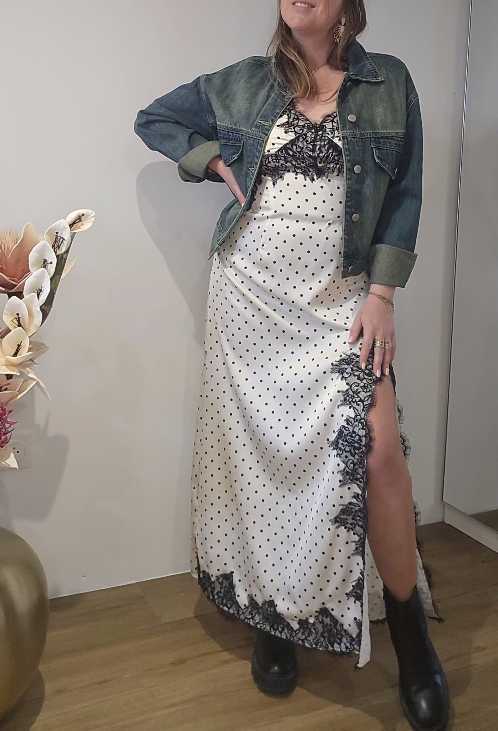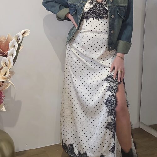 Robe sur fond blanc avec impression pois noir, fendue sur le devant droit, découvrant légèrement la jambe jusqu’à mi cuisse.