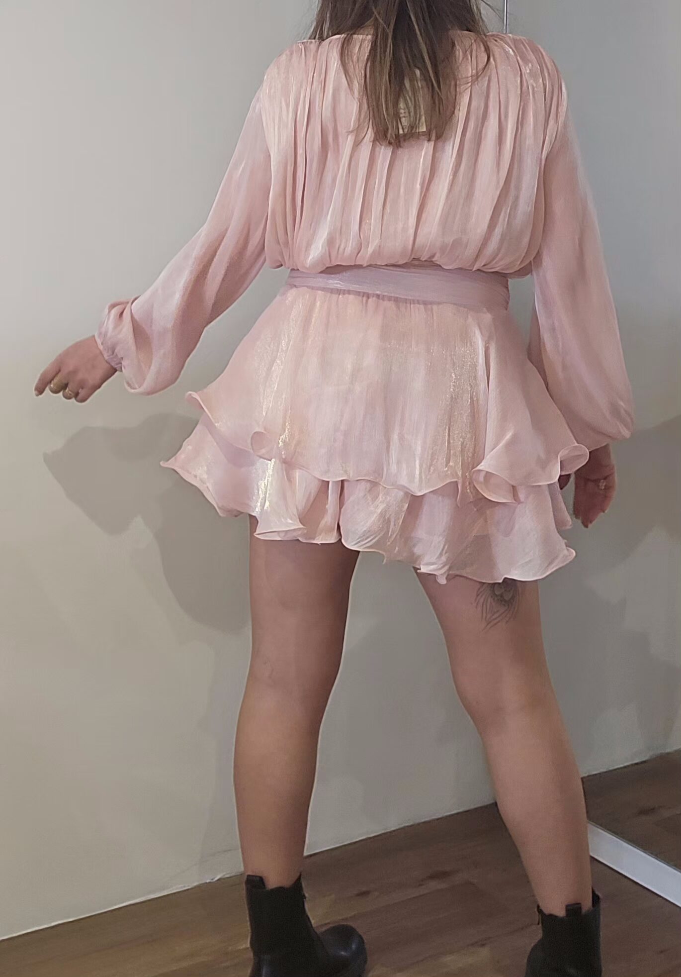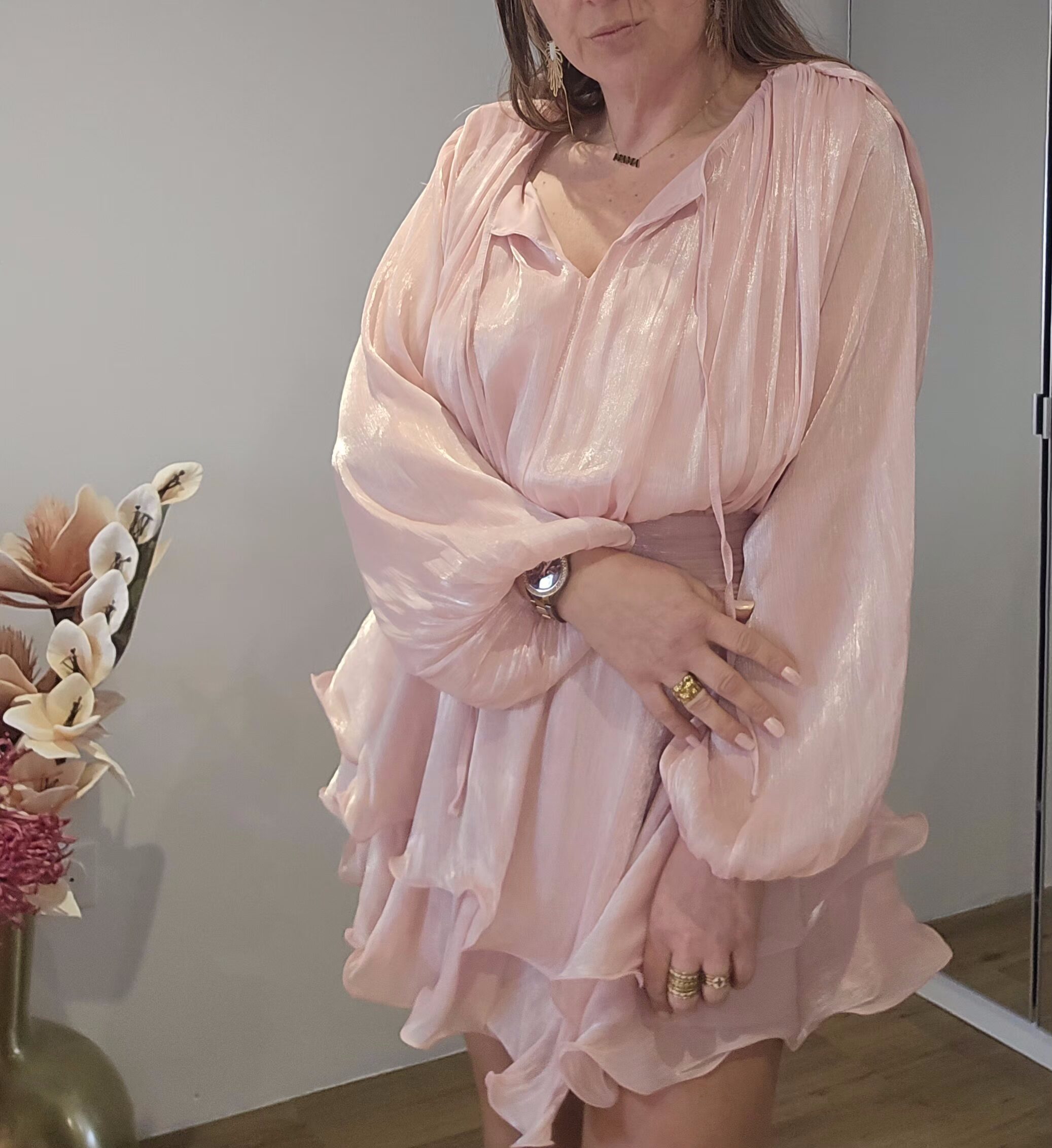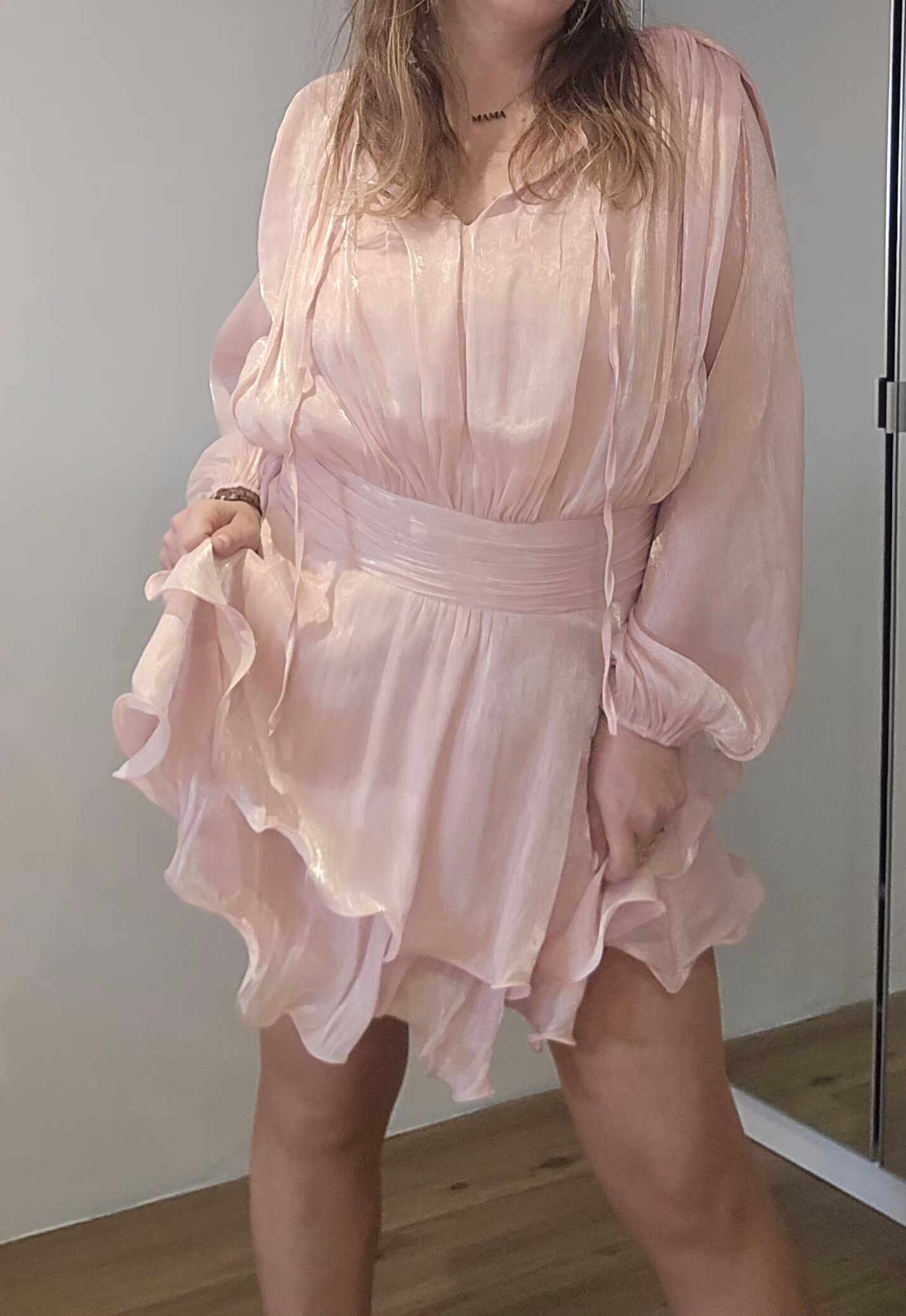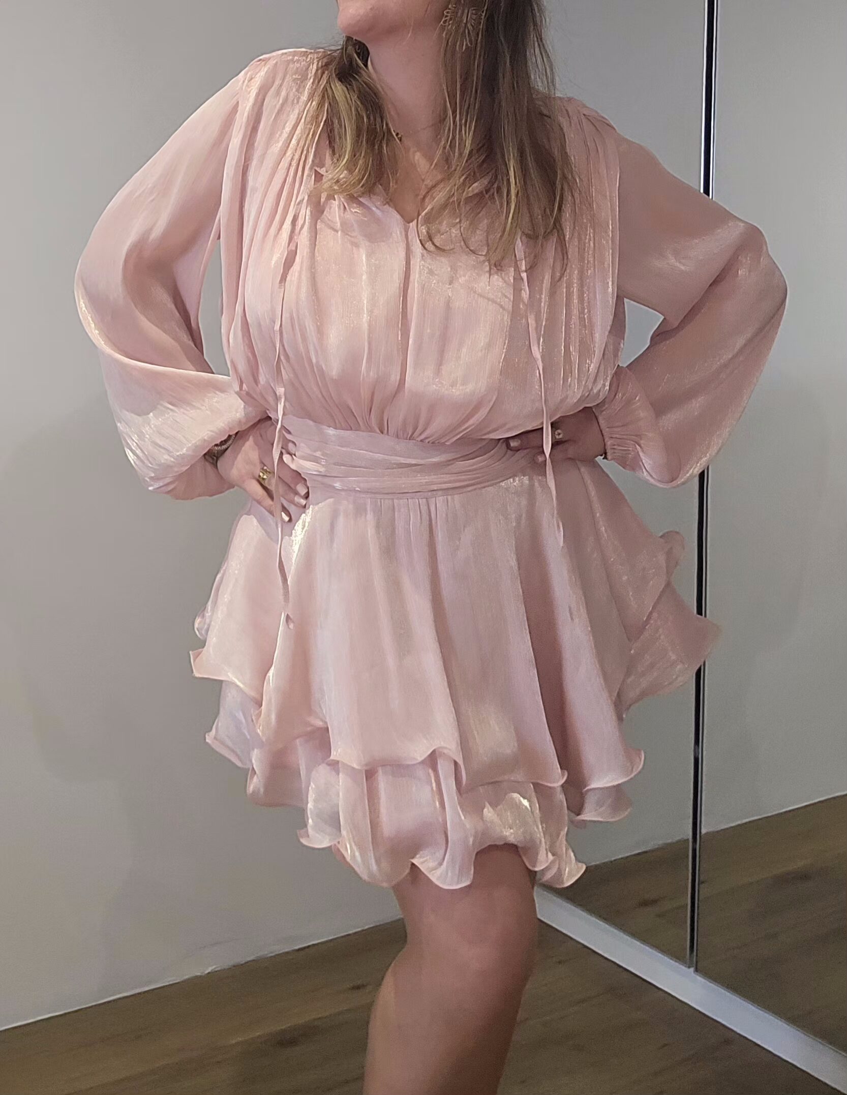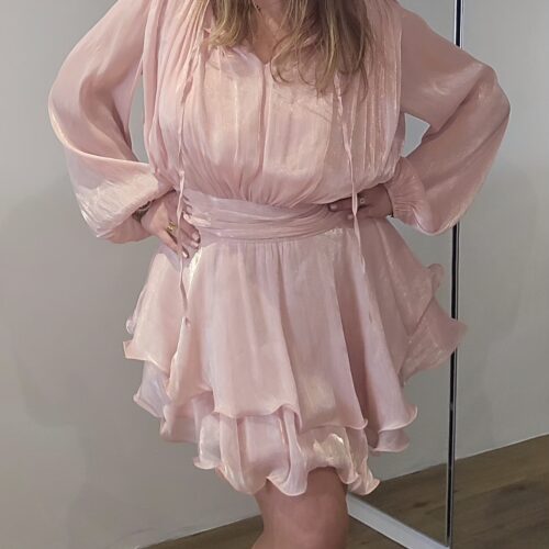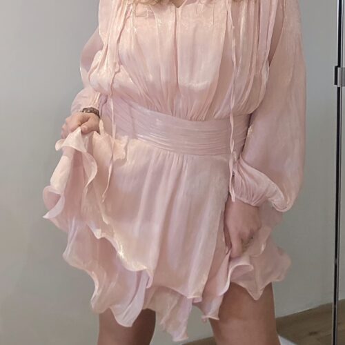 Robe rose poudrée, manches longues, drapée sur les hanches.